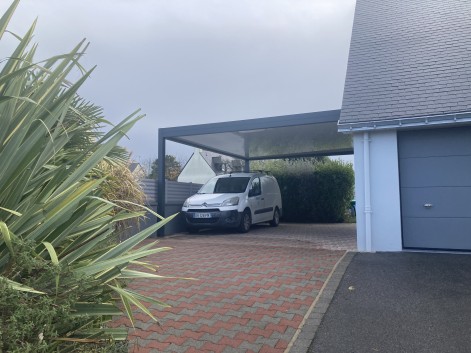 Sur la commune de Redon, nous sommes venus poser un carport sur un pignon de maison, nécessitant ainsi que de deux poteaux. Entièrement en aluminium, y compris pour la toiture. Sa dimension permet d'accueillir deux véhicules.