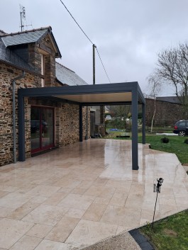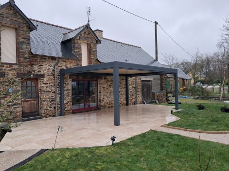 Posée sous la pluie, mais prête pour les beaux jours ! Cette pergola bioclimatique permet à nos clients d'avoir leur terrasse couverte pour la belle saison.
