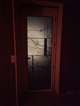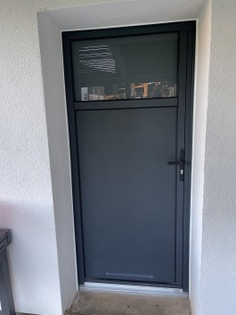 Une porte d'entrée en aluminium entièrement vitrée avec un vitrage dépoli permettant de garder l'intimité de son entrée mais d'apporter un maximum de lumière dans la maison.