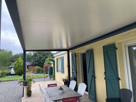 Une terrasse couverte avec un préau en aluminium. Une pose avec 4 poteaux et un toit en panneaux sandwich blanc/blanc. Nos clients peuvent maintenant profiter de leur terrasse toute l'année.