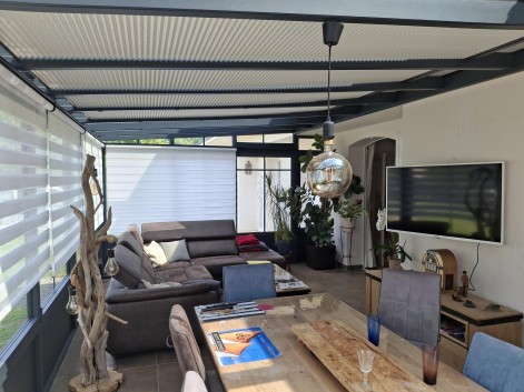 Des stores rouleaux sur les châssis et en toiture des stores plissés. Le tout permettant à nos clients de se protéger davantage de la lumière.